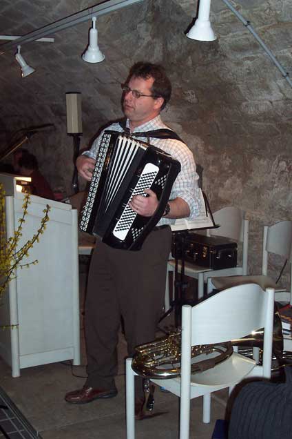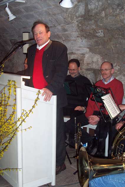 Ein weiterer Höhepunkt des Abends waren die Auftritte des Maulbronner Bürgermeisters Andreas Felchle mit seinem Akkordeon (die Betonung liegt übrigens auf „Maul“, so Felchle) So intonierte Andreas Felchle nicht nur die schwäbische Nationalhymne „Preisend mit viel schönen Reden“ mit den Gästen im Schlosskeller, sondern präsentierte auch eine selbst gedichtete Version des alten Udo Jürgens-Titels „Griechischer Wein“. Wie konnte der neue Titel auch anders heißen als „Urbacher Moschd“(Text.pdf). Dieser Song, hat jedenfalls das Zeug dazu, zur Urbacher Hymne zu werden. So klang der Abend im Schlosskeller mit launige Musik von der „Urbacher Mostband“ und gemütlichem Beisammensein aus. Für den Wohlfühlfaktor bei diesem Event (wie man heute wohl auf neudeutsch formulieren könnte) sorgten einmal mehr bravourös die Urbacher Landfrauen, die emsig und schaffig wie sie nun mal sind, dafür sorgten, dass es den Gästen an nichts mangelte. |